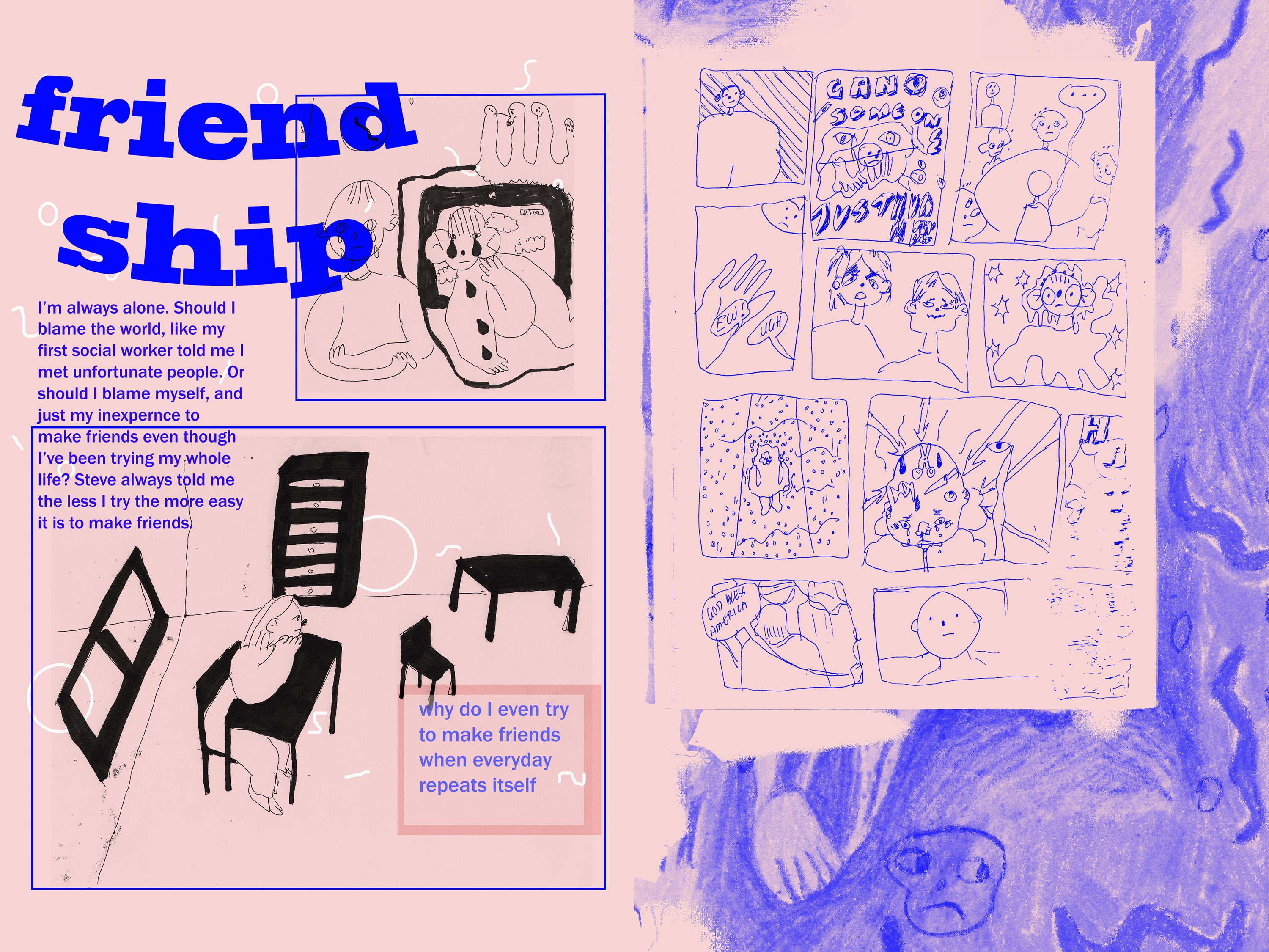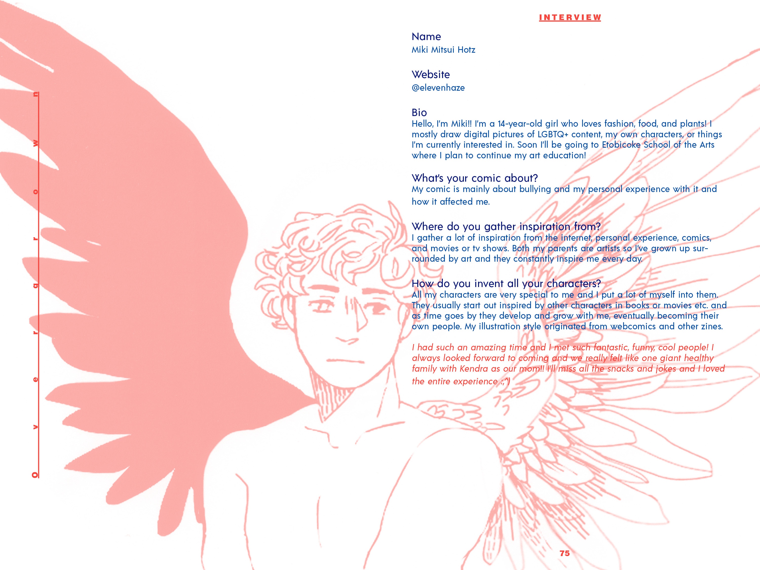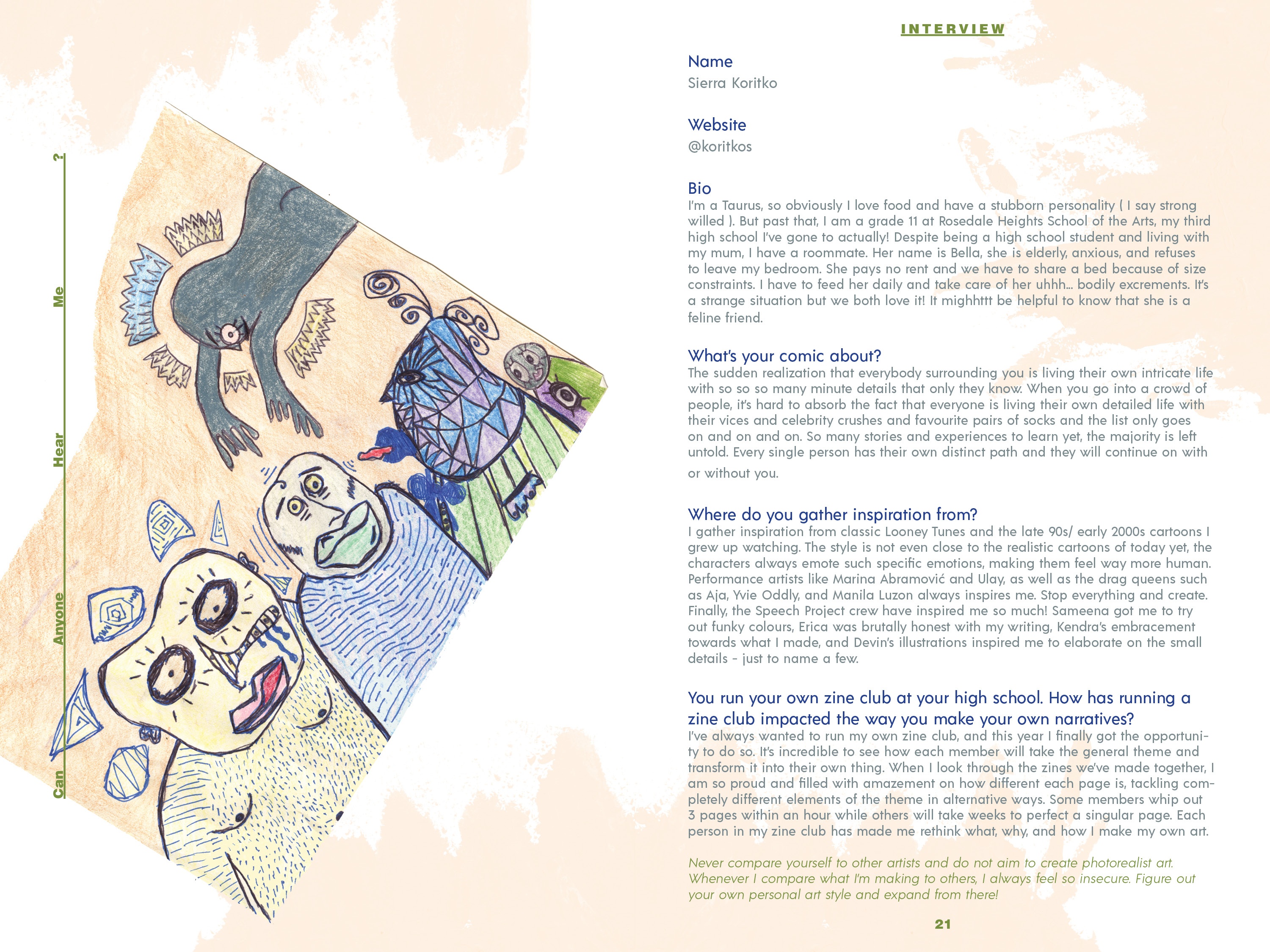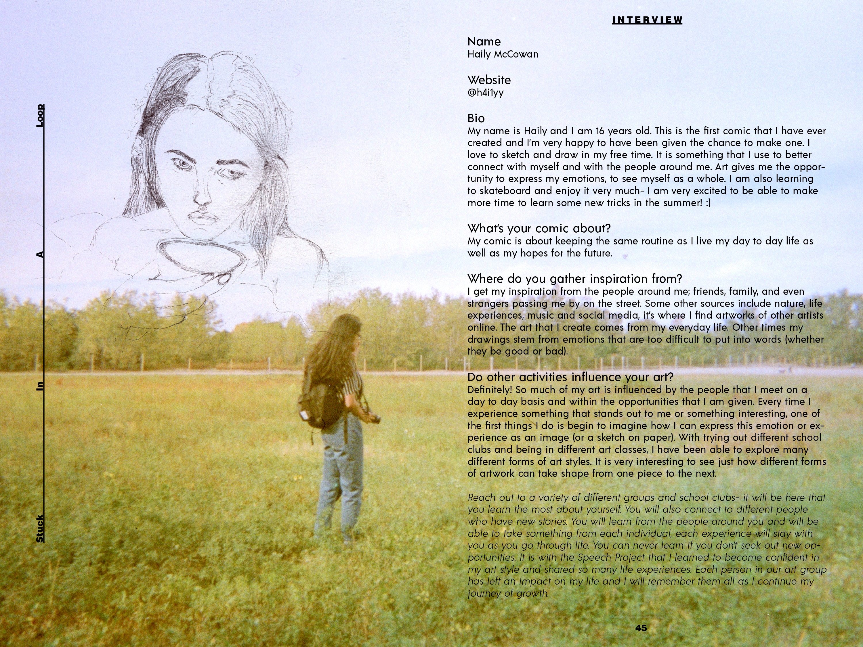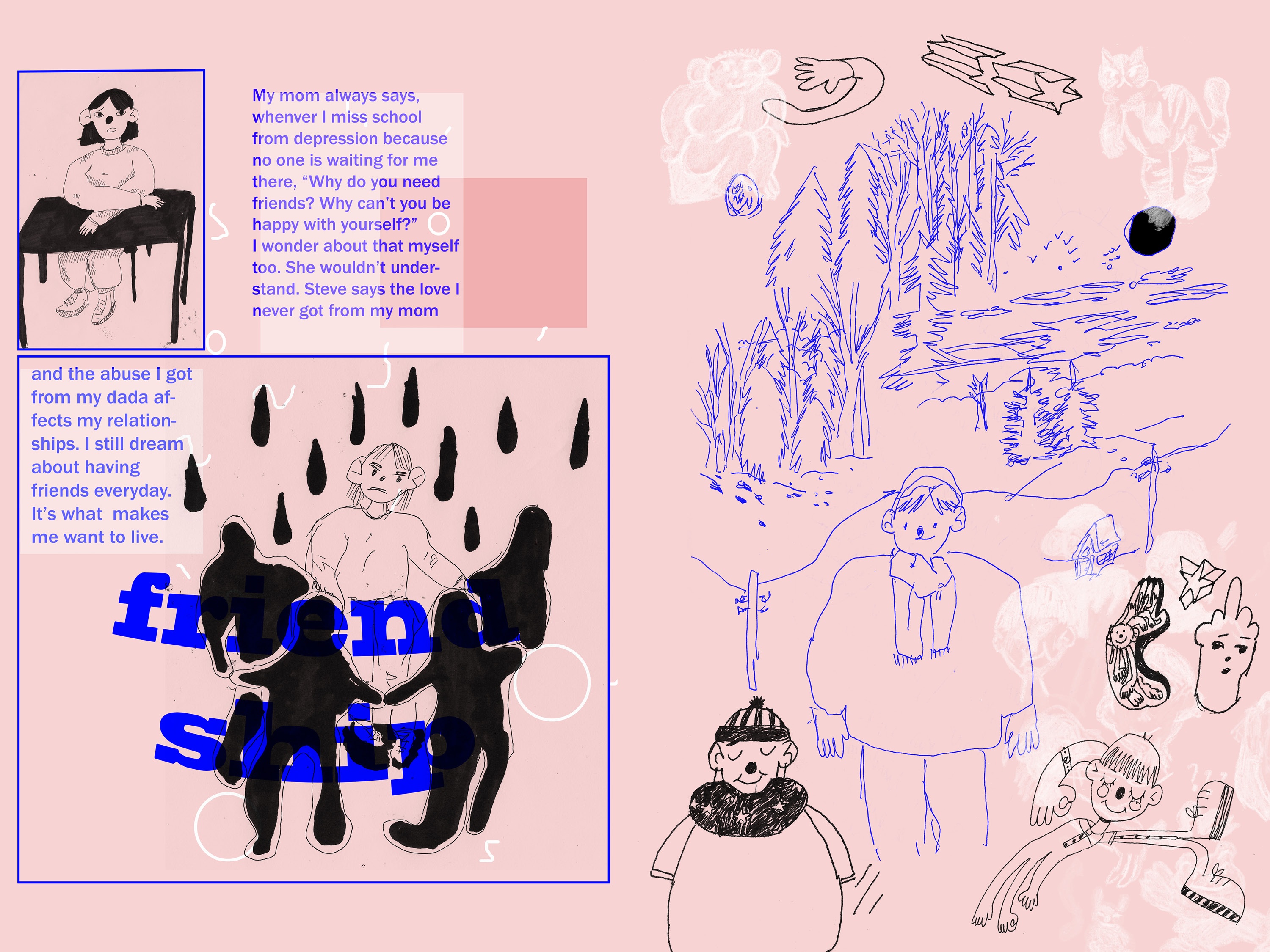 From September 2018 to March 2019, Speech Project was a weekly meet up of 10 teens who laughed, discussed, snapped pictures, drew, painted, chatted, danced, designed, ate snacks, and told stories together. The sessions took place at Davenport-Perth Neighbourhood and Community Health Centre (DPNCHC), a multi-service agency located in Toronto’s West End. Participants from different areas and high schools across the city came together to create comics based off of their personal narratives.